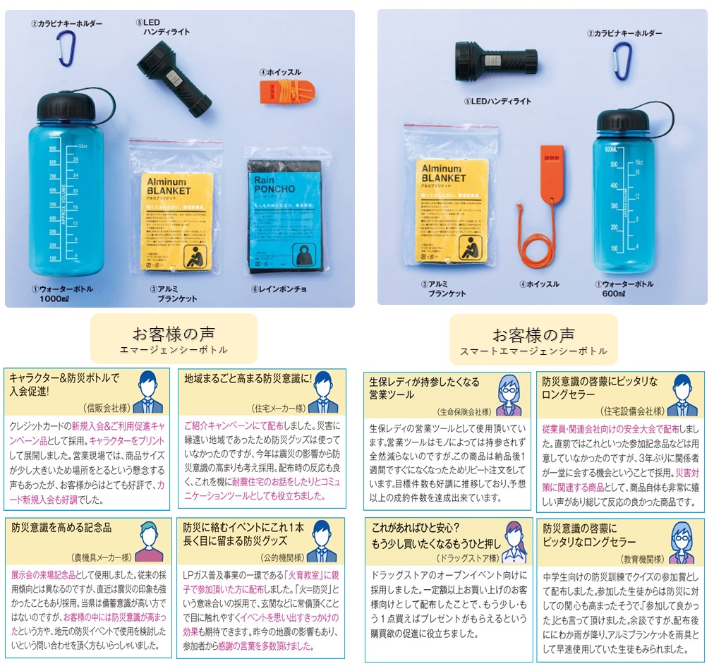 災害緊急時やアウトドアシーンで役に立つアイテムをウォーターボトルにセットしました。