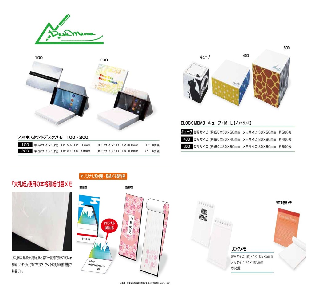 規格 | 商品明細 | 「オリジナル メモ」 受注生産商品の為、基本1,000個からの生産となります。 デザイン、素材、仕様、納期、価格等は担当営業にご相談ください。 |
