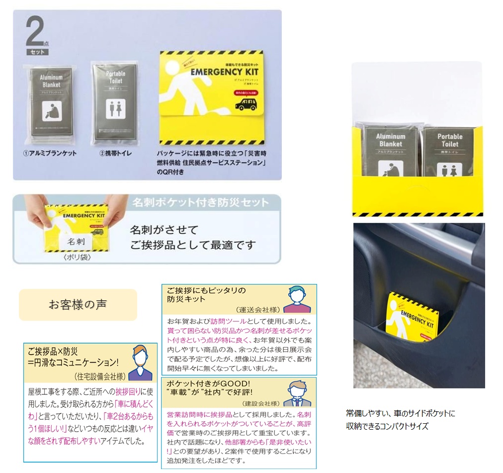 渋滞や非常時のために車にも常備できる安心の防災キット アルミブランケットと携帯トイレの薄型タイプで保管場所を選びません 車のサイドポケットに入るコンパクトサイズ |