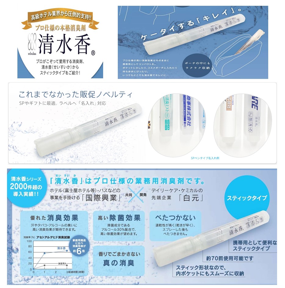ペン型スプレータイプの消臭剤。 ホテルを中心に4,000軒を超える施設に導入実績のあるプロ専用消臭剤の携帯サイズ。 嵩張らず持ち運びも保管も楽々。 汗、タバコ、トイレなどへの高い消臭効果があります。 |