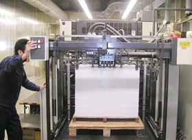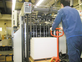 用紙の納入については、原則スキットにてお願いしてきたが、以前は、半裁判の場合ダブルスキットでの納入の為、自社での積み替え作業が発生しており非常に生産効率が悪かった。しかし今回華陽紙業さんからのスキットは、菊判半裁までをシングルにて対応してもらい作業工数低減にもつながり非常に生産効率も上がった。又ワンプ等のゴミ処理も不要のため、ISO取得企業にとっては、環境保全の面からも非常にありがたい。 |