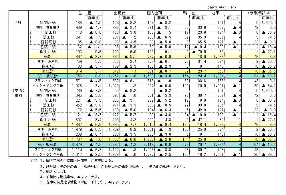 - ・紙・板紙の在庫は前月比4千トン増、2か月連続の増加。グラフィック用紙は4千トン増、4か月ぶりの増加。パッケージング用紙は1千トン減、2か月ぶりの減少。衛生用紙は1千トン増、2か月連続の増加。グラフィック用紙では、新聞用紙と塗工紙が増加。パッケージング用紙では、包装用紙とその他の紙・板紙が減少。