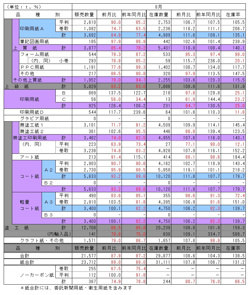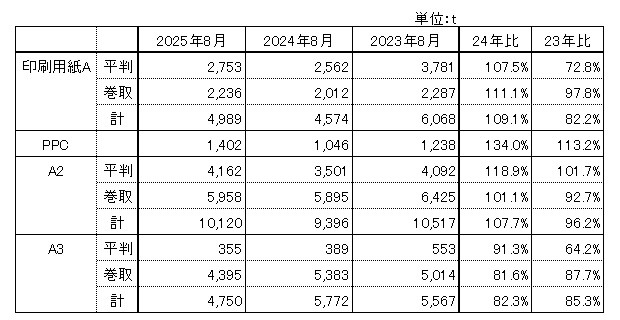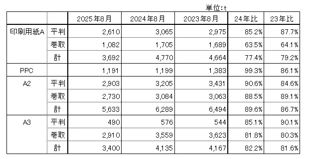 KAYO NEWS 華陽ニュース 2025年8月 品種別販売実績表 [中部版] 2025.09.30 名古屋洋紙代理店会の8月の販売・在庫数量です。 ※8月の紙合計の販売数量前年同月比は89.0%、主要品種は全て前年比マイナスの結果となりました。 名古屋洋紙代理店会 主要品種販売・在庫数量 3ヵ年比較 販売数量 在庫数量