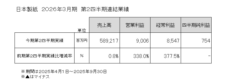 日本製紙は11月6日、2026年3月期第2四半期(2025年4月1日~2025年9月30日)の連結業績を発表しました。