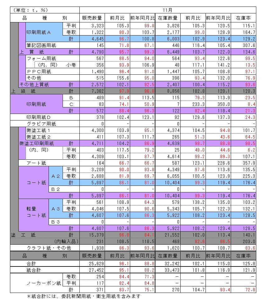 名古屋洋紙代理店会の11月の販売・在庫数量です。