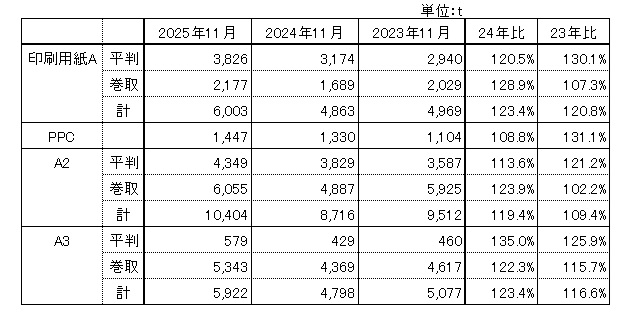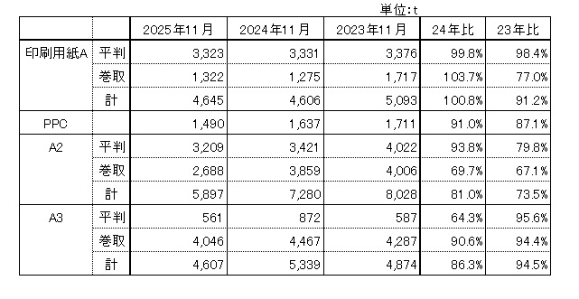 ※11月の紙合計の販売数量前年同月比は88.8%、主要品種では印刷用紙A(巻)のみ前年同月比プラスの結果となりました。