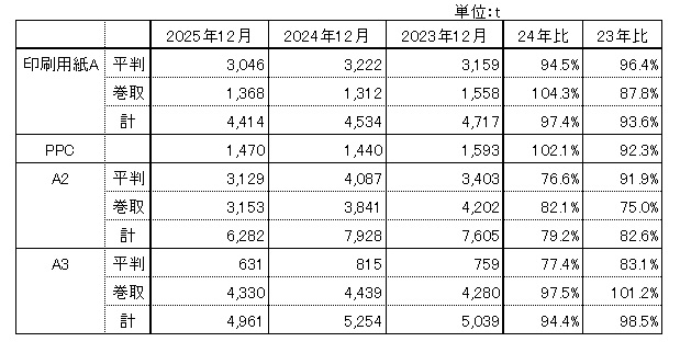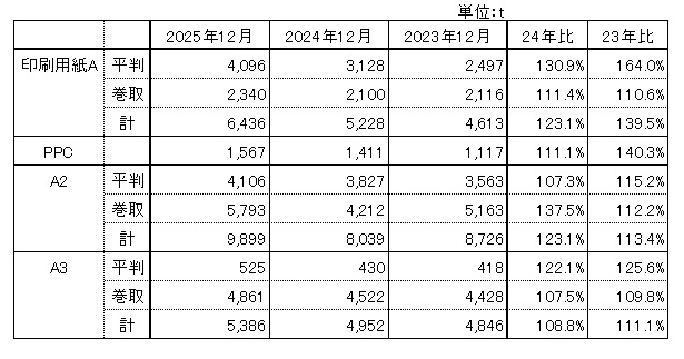 ※12月の紙合計の販売数量前年同月比は93.3%、主要品種では印刷用紙A(巻)とPPC用紙が前年同月比プラスの結果となりました。