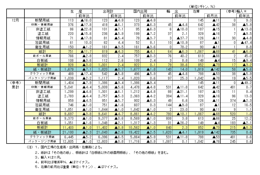 2025年12月全国紙・板紙需給速報