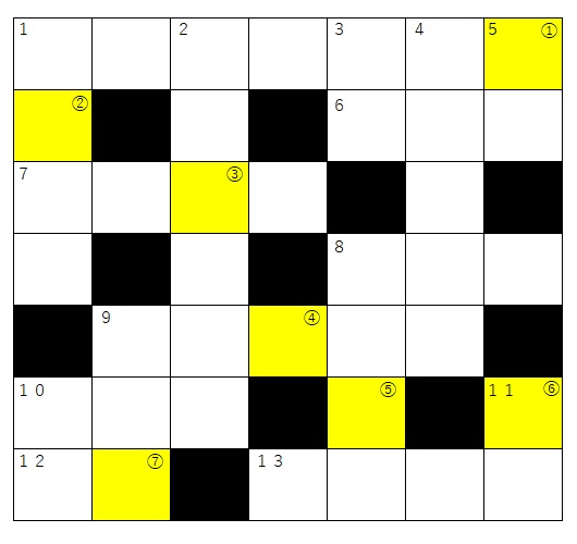 クロスワードを解いて、黄色いセルの文字をローマ字表記にし、一文字目のアルファベットを取り出して下さい。