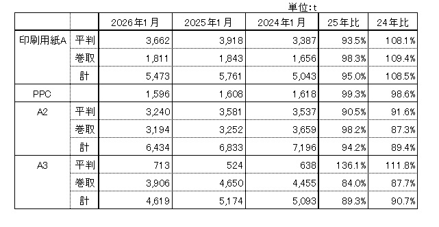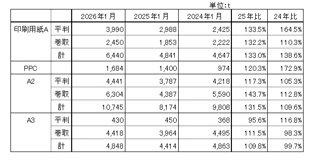 ※1月の紙合計の販売数量前年同月比は96.1%、主要品種ではA3平判が前年同月比プラスの結果となっています。