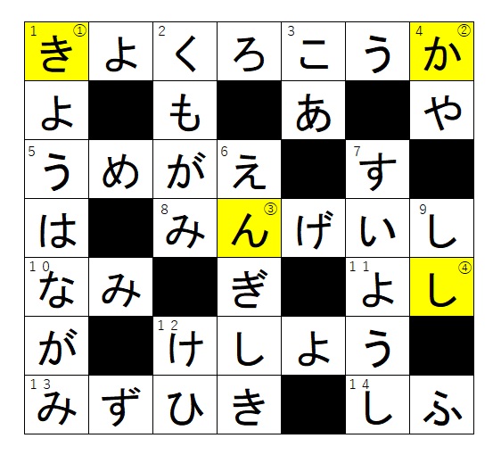 クロスワードを解くと上のようになるので、黄色いマスの文字を番号通りに当てはめると